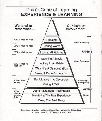 His concept is similar. But still, I strongly Encourage you to read his article.EDIT 16-04-2018: Just to make clear me being „pissed off” was a failed attempt at light humour. I forgot old rule that text is harsher then speech. - This is not really article I’ve found old diagram representing Dale’s Cone of learning.